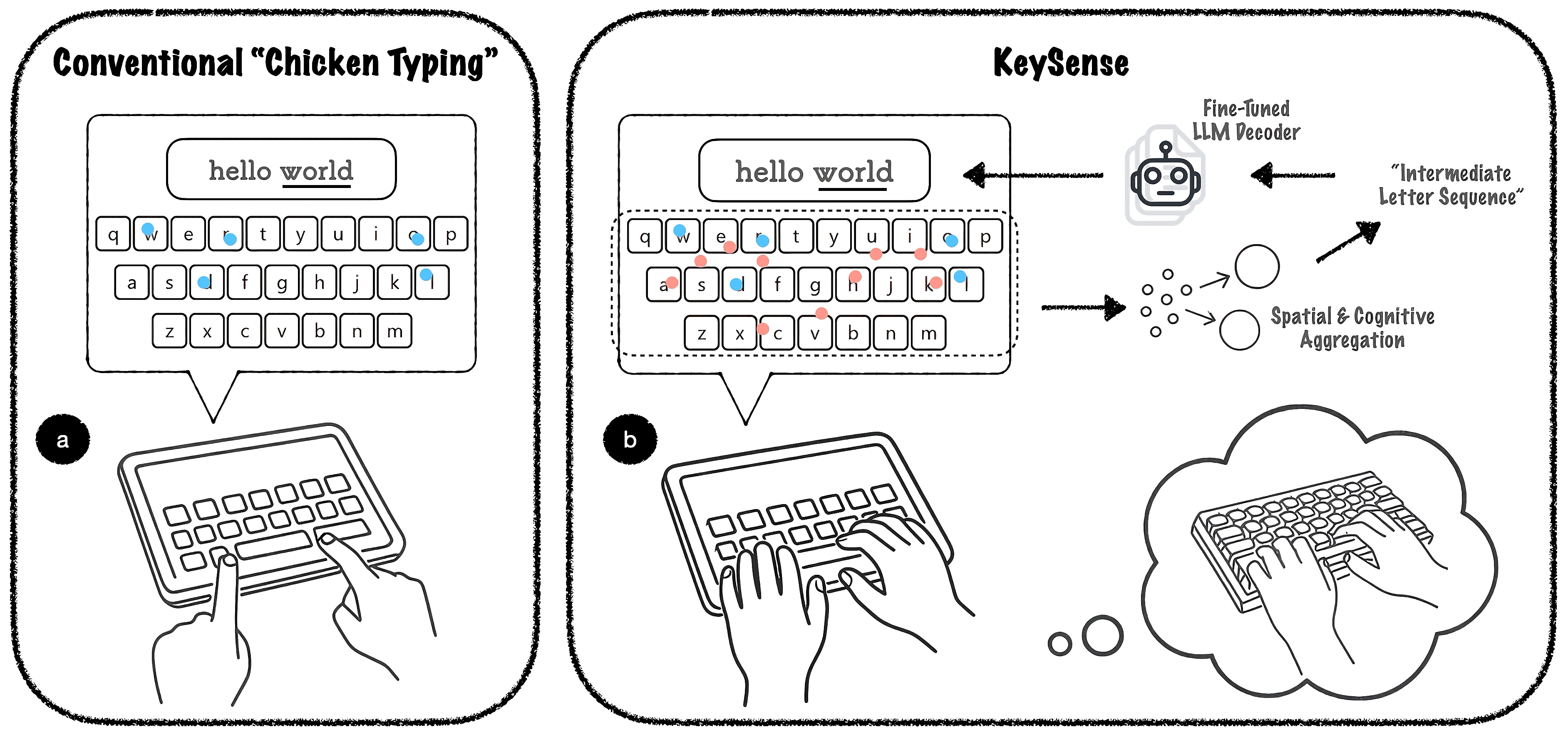 KeySense turns commodity touchscreens into hands-down ten-finger keyboards by distinguishing resting contacts from intentional keystrokes and decoding them with a fine-tuned large language model. It reuses physical-keyboard muscle memory, enabling fast, low-fatigue text entry without extra hardware.